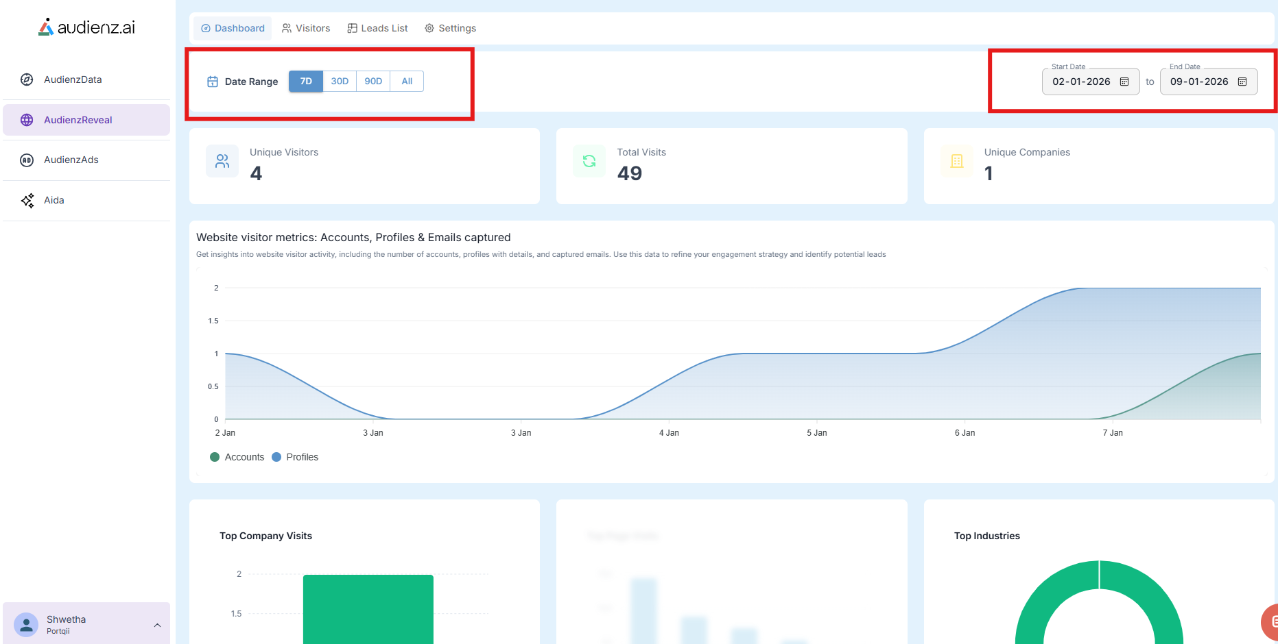 The AudienzReveal Dashboard provides a consolidated view of who is visiting your website, when they visit, and key attributes associated with those visits. This dashboard helps you understand visitor behavior, company-level interest, and engagement trends over time.