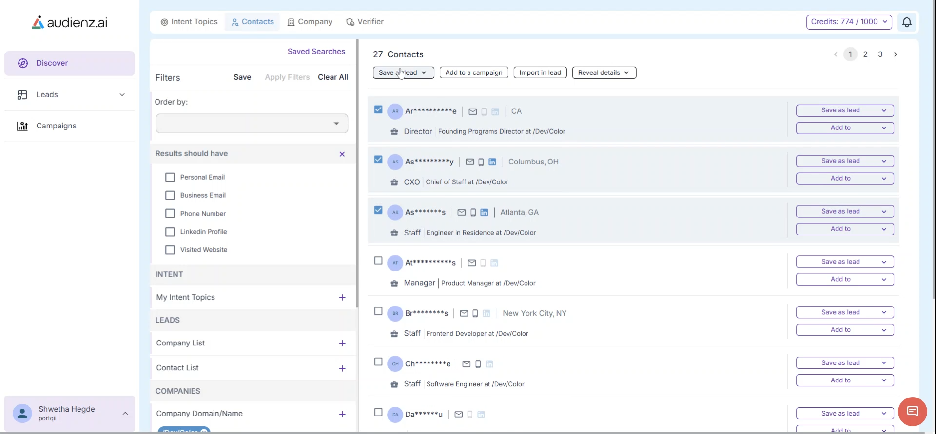 Click on "Save as lead" to add the chosen contacts to an existing list.